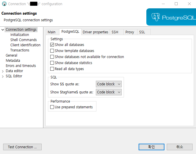 PostgreSQL 탭 선택 후 Show all databases를 체크한 후 확인버튼을 클릭합니다.